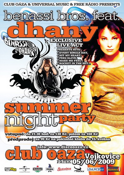 Je to tak ! Začíná léto a na Oáze startuje letošní summer world megastar tour. Po úspěšných vystoupeních Shauna Bakera, Pakita, Jana Wayna a Daisy Dee, přivážíme i letos show dalších zahraničních megastar. Jako první se naší letní tour představí ze svojí energickou live show Italská kráska a dvorní zpěvačka formace Benassi Bros lady Dhany. Za doprovodu svých dvou tanečnic vám živě zazpívá to nejlepší z produkce této již legendární djské bratrské dvojice. Tuto noc ušlyšíte hity jako Every single day, Hit my heart, Make me feel, Feel Alive a spoustu dalších. Co více dodat ? Snad jen, že toto exkluzivní vystoupení , které bude zároveň i premiérou tohoto projektu na Jižní Moravě by si neměl žádný příznivce taneční hudby a hitů z dílný formace Benassi bros ujít. Tento večer se můžete těšit nejen na párty uvnitř klubu, ale i na venkovní stage na naší terase. K dispozici bodou čtyři bary, fastfood s občerstvením a speciality na grilu. Celý večer vás budou bavit naše go-go tanečnice a samozřejmostí je i fotoreport s autogramiádou a natáčení naší TV Oáza. Do 21:30 vstupné za 130, poté 160 CZK