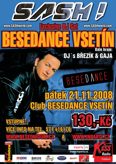 Jeden z nejúspěšnějších a nejznámějších Djů Německa se vrací do České republiky. Legenda světové taneční hudby DJ SASH! má na svém kontě přes 17 miliónů prodaných desek po celém světě, za dobu své dvanáctileté hudební kariéry dobyl přední příčku snad každé rádiové, taneční a prodejní hitparády v Evropě. DJ SASH! (Sascha Lappessen) má na svědomí takové světoznámé taneční šlágry, kterými jsou například Ecuador, Encore Un Fois, La Primavera, Mysterious Times, Adelante, Gambareh, I Believe a mnoha dalších...Zažijete tak jedinečnou atmosféru plnou energické taneční muziky, nestárnoucích tanečních hitů v exklusivních remixech a skvělou Djskou show podpořenou Sashovým živým vokálem. Zapaříte, jak na největší taneční hity dnešních dní, tak na původní tvorbu DJe SASH!e ve speciálních tanečních a clubových mixech.Jak dodává sám DJ SASH! „Ladies and gentleman now it´s time to dance to the beat of SASH!“ A my se těšíme... Toto jedinečné energetické vystoupení můžete zažít na vlastní kůži již za několik málo dnů a to v pátek 21. 11 v clubu Besedance, Vsetín (www.besednidum.cz) Vyhrej s inparty.cz lístky na toto vystoupení!